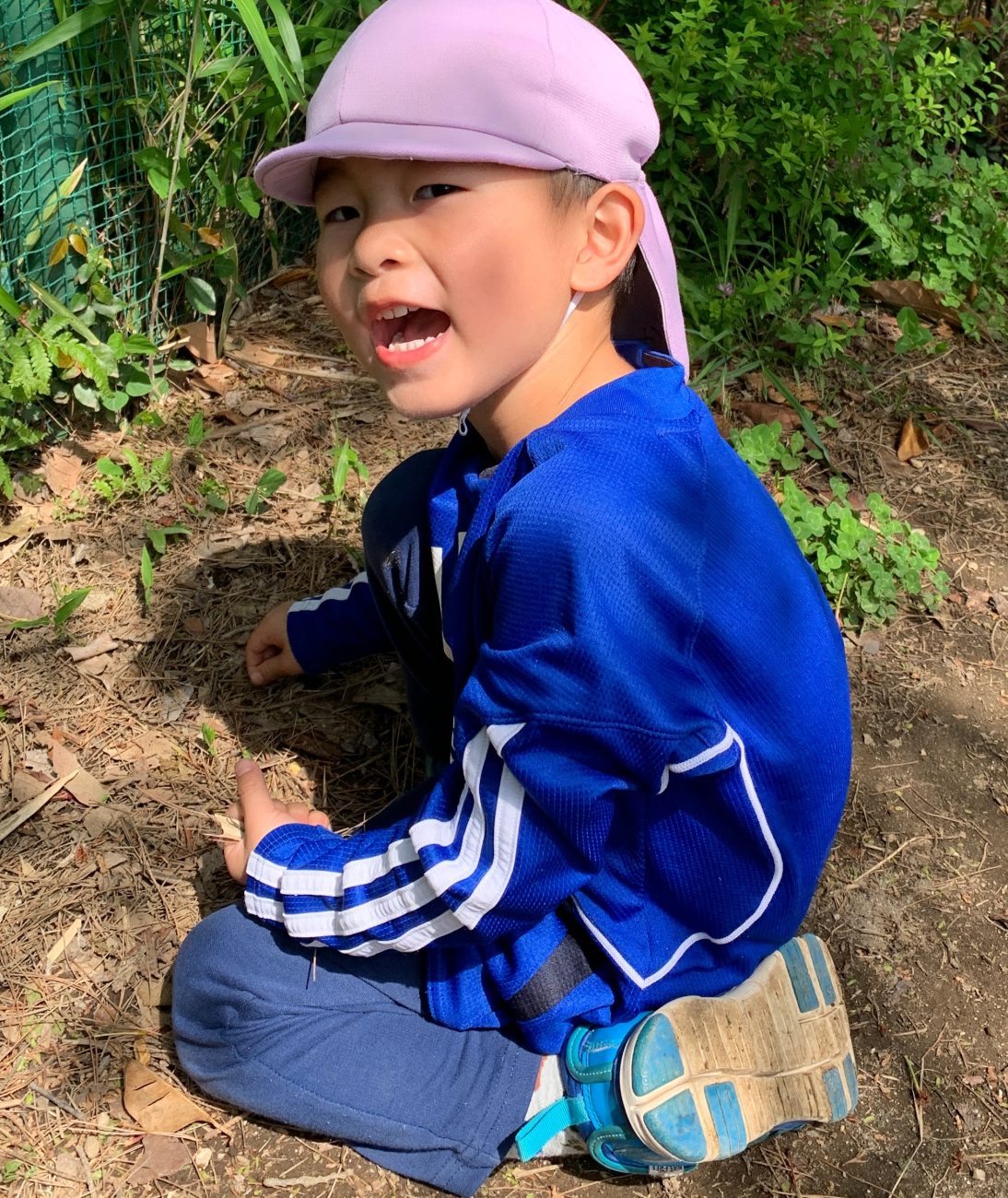 もも組に進級して、また一つお兄さんお姉さんになった子ども達。ドキドキしながらもその表情はどこか自信に溢れています。そんな子ども達は、自然がいっぱいのプラスの園庭で遊ぶことが大好き!「今からお外に行きます!」と伝えると、一斉に「イエーイ!」「やったー!」の歓声が上がります。帽子に靴下、水筒を準備して外に出ると、まずは遊んでもいいゾーンを大人としっかり約束します。