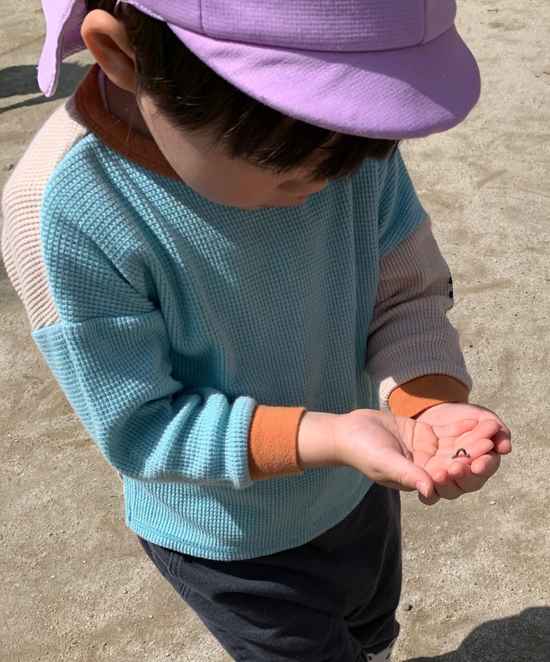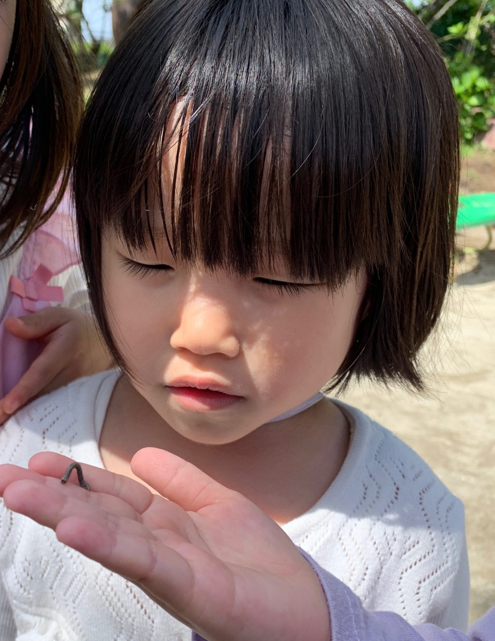 もも組の子ども達は今、草花や生き物などの自然物に興味津々です。小さな尺取り虫を見つけると、手のひらに乗せてその動きをじっくり観察していました。「お腹が上に曲がって伸びて進んでるね~」「かわいいー!」「くすぐったいね」とそれぞれに尺取り虫への感想を言葉にしながら、交代交代で手のひらに乗せていました。