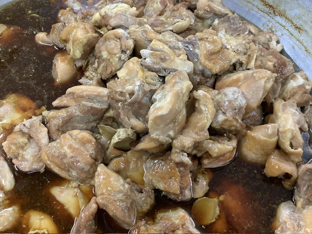 きび糖、酒、みりん、濃口醤油、生姜を鍋に入れ煮たたせたところに、鶏もも肉を入れて、落とし蓋をし、あとは、ほったらかし♪お肉に味が染み込んで美味しいですよー!