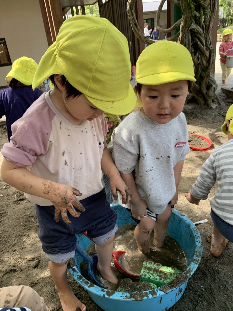 水を入れた瞬間、バケツの中の泥に興味を持ち触りに行く子どもたち。
