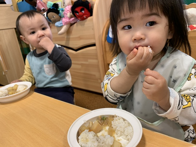 日々の給食やおやつの中で、食材・料理への興味を少しでも持つことができるようその日の献立や季節の食材など伝えるようにしています。少しでも食への興味が沸き、食べれるものが増えるといいなと思います。