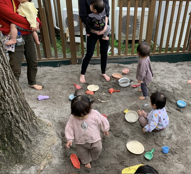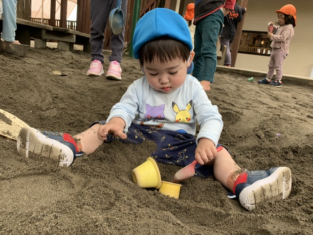 日々遊びを行なうことで砂に親しみを持ち、寝転んでみたり水と混ぜてみたりと感触を味わう姿に、成長を感じています。