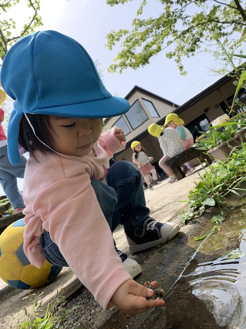 ビオトープに近づき不思議そうに水に触れてみたり