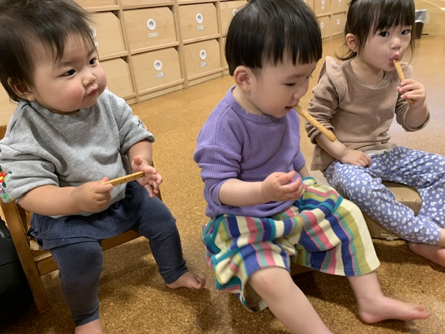 4月当初は、新しい生活に慣れず涙をすることもありましたが、園庭で気分転換におやつを食べることで楽しい雰囲気で食べられています。