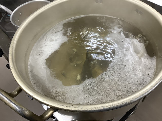 給食室では朝から出汁をとることから始まります。いりこ、昆布、大丸かつおパックを1時間かけて煮出します。出汁を取ったあとは、ふりかけや佃煮にします。