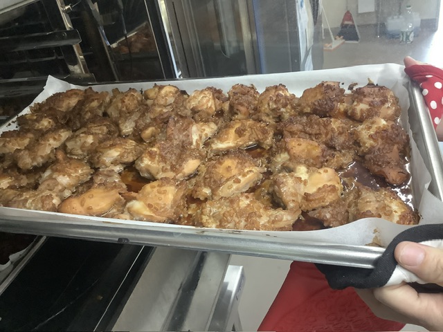 給食室自家製の醤油麹を、一真から届いた鶏肉とすりおろしニンニクに漬け込みました。