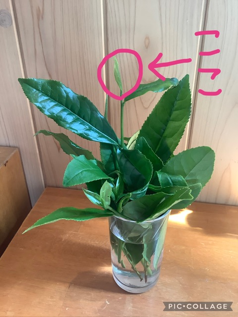 伊集院にある、新山茶園の方から茶葉をいただきました。お茶になる部分は先っぽの小さな若芽だけとのこと。とても貴重な茶葉、正面玄関のお茶コーナーに展示していますので、手に取って見てくださいね♪