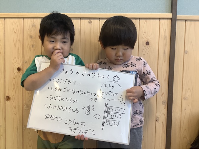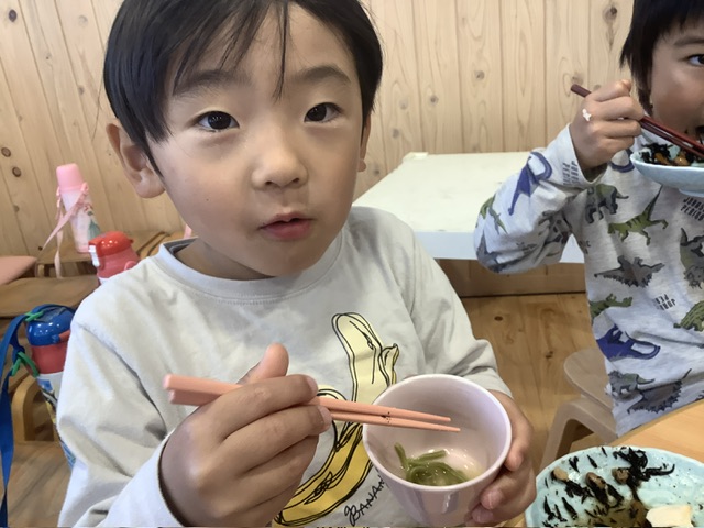 給食の時間にさくら組さん、もも組さんが少しずつ食べました🥢