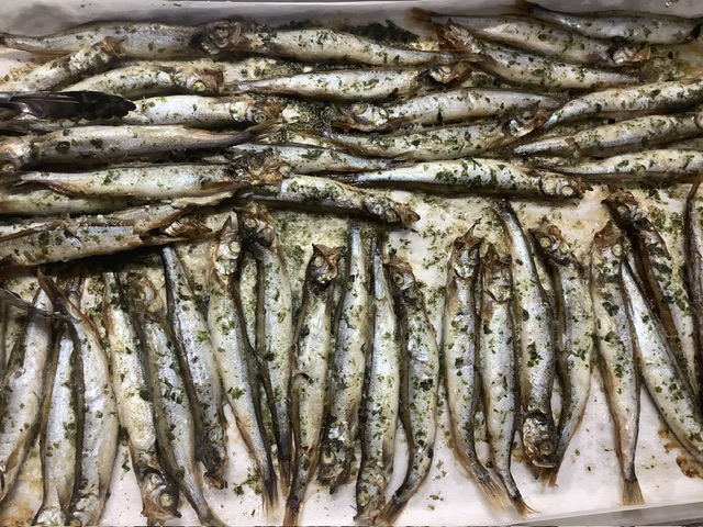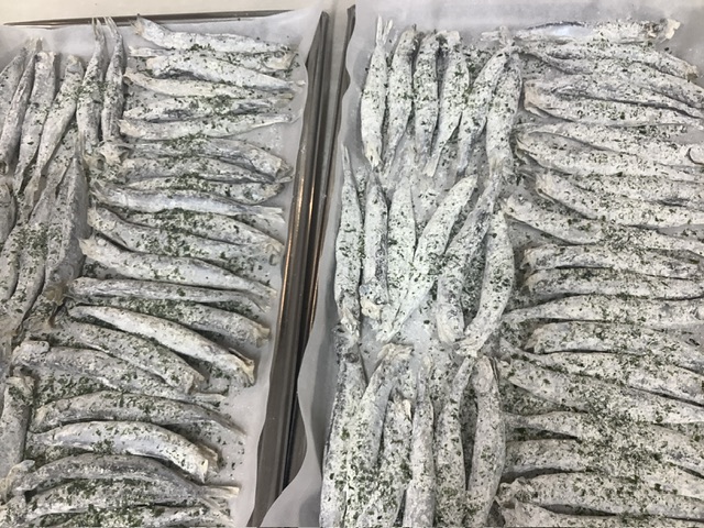 ししゃもに小麦粉と青のりを加えた粉をまぶし、軽く油を塗って、こんがり焼き上げました。