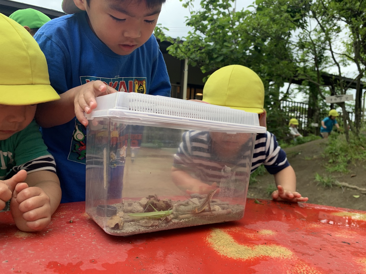 晴れ間があるとカナヘビも一緒に外へ。外に出ていた他のクラスの子どもたちも「これなーに?」と興味津々。「カナヘビだよ~」と教えたり、「あんまり(虫かご)動かすとびっくりするから、優しくだよ!」と伝えたりする姿がありました。