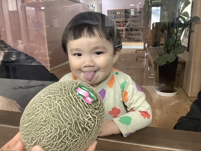 こどもの顔と同じ大きさ程あるメロン、美味しそうだな〜と舌をペロッとだす姿が可愛いくてたまりません!