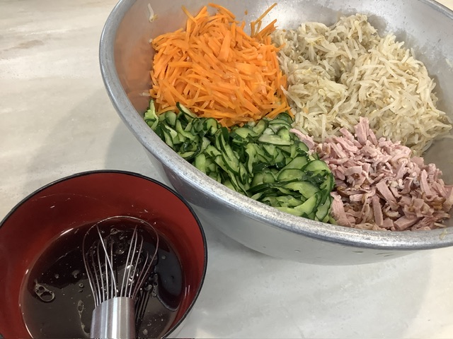 もやしと、せん切りにした人参・きゅうり・南州農場のハムをスチームで加熱し、酢・濃口醤油・きび糖・ごま油で和えています。
