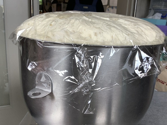 ドライイーストを混ぜた生地を、温かい場所で発酵させていきます。発酵が進んだ生地は、ボウルから溢れそうなほど大きく膨らみました!