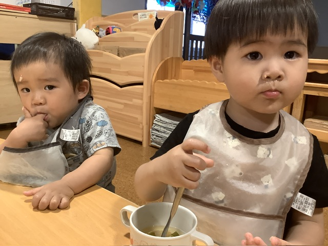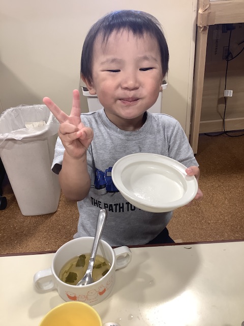 給食の様子を私たちも見に行くと、「お野菜食べられたよ〜」と、ぴかぴかになったお皿を誇らしげに見せてくれました!