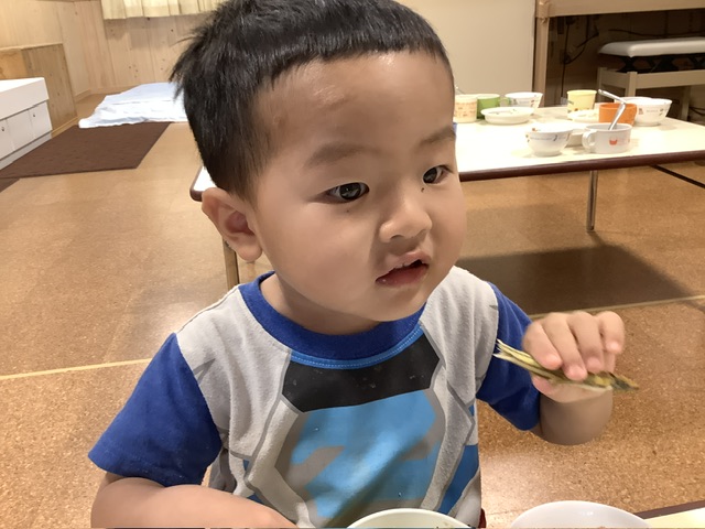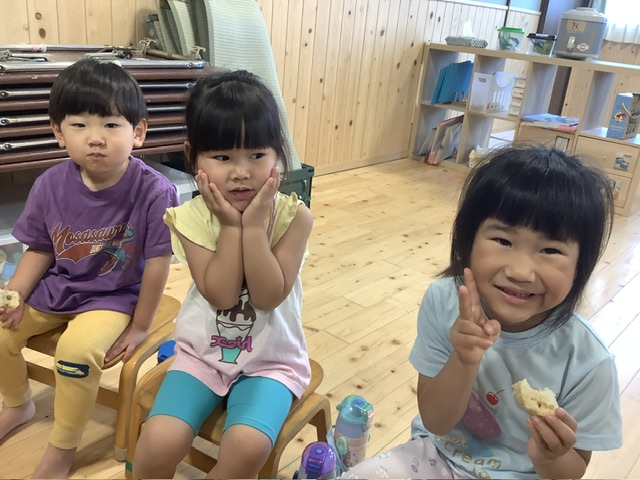 錦ヶ丘プラスでは、前歯を使って食べ物をかじり取る練習ができるような給食をメニューに取り入れています。「前歯で噛む」ということは、子どものあごを発達させる上でとても重要ですし、前歯でしっかり噛むことであごの成長を促進させると言われていて、小さい頃からしっかりと「噛む」という刺激を与えることが大事なのだそうです。