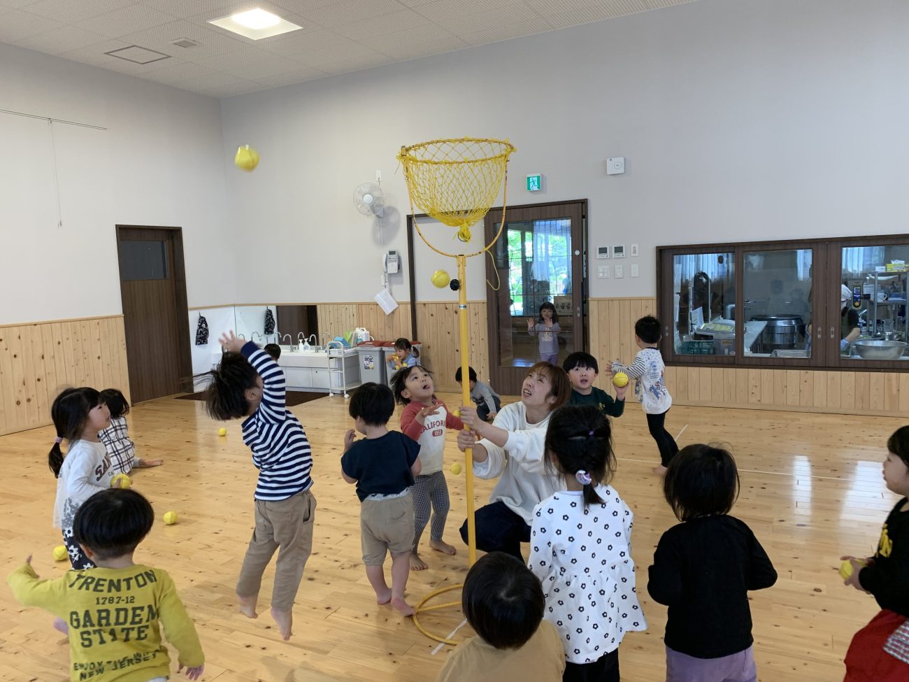 まだボールをコントロールすることが難しいきく組の子どもたちは、「ボールは、入らないからやりたくなーい」と自信が持てない様子でした。
