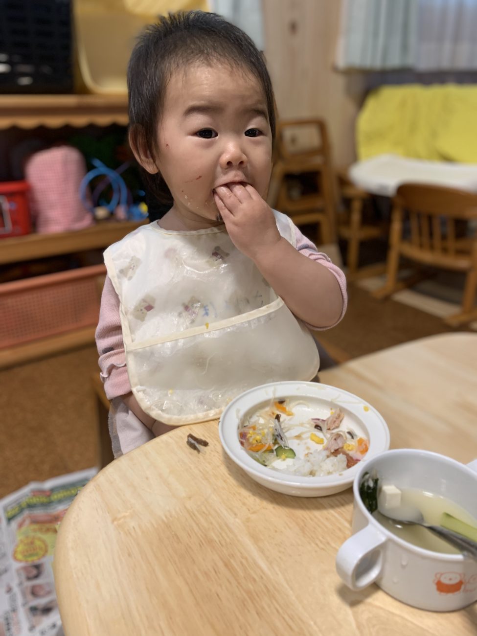 一つの食材を掴んで食べることで美味しく食事が進み、後々に偏食が少なく食への興味が湧いていきます。この触る感覚が戸外で葉っぱや小石を掴んだり、砂遊びや泥遊びへと抵抗なく遊びこめる活動へと繋がっていきます。