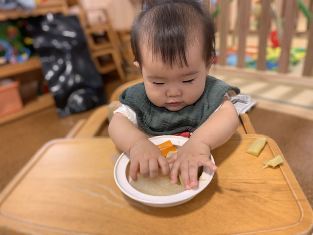 錦ヶ丘プラス+では、乳幼児期から『手づかみで自ら食べる』という事を大切にしています。