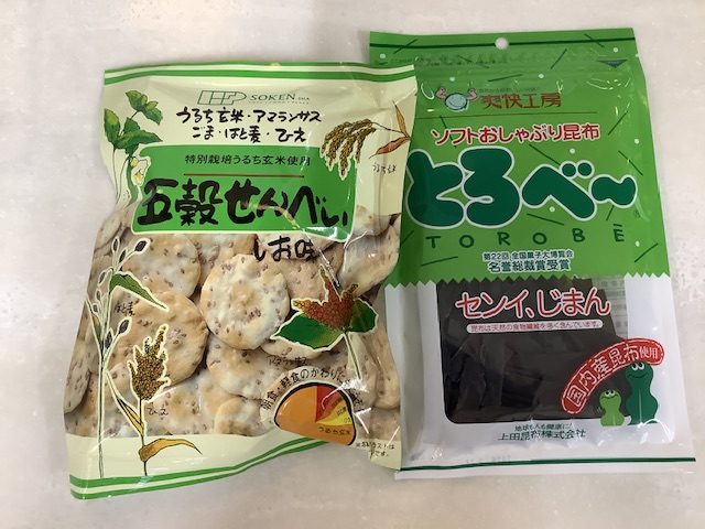 今日のおやつは寿草から届いた、おしゃぶり昆布と五穀せんべいでした。