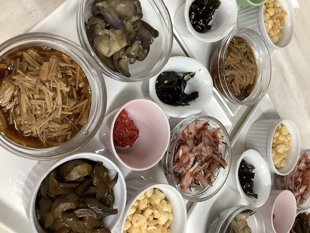 らっきょうたたき梅、なすのぬか漬け、梅干し、なめたけ、揚げ玉、かつお節ふりかけ、きゅうりのキューちゃんです!