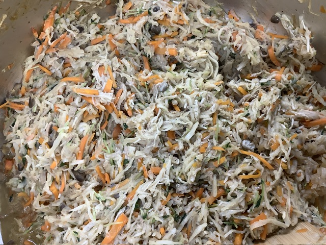 切干大根、にんじん、しめじ、えのき、豆苗、ツナが入りました。こども達が食べやすいように、ツナを加えました。それでも千切大根は苦手な子が多く見受けられます。どの組み合わせなら食べやすいかなと、給食チームは日々試行錯誤しています🧑🏻🍳