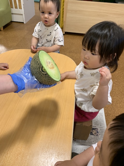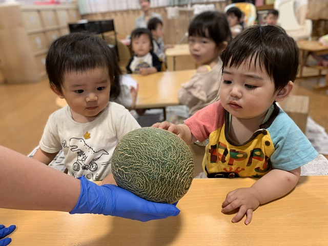 1玉丸々のメロンは初めて見る子も多く、恐る恐る手を伸ばして触れていました。