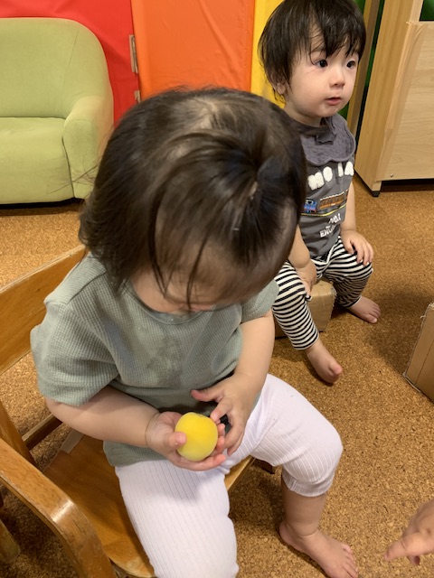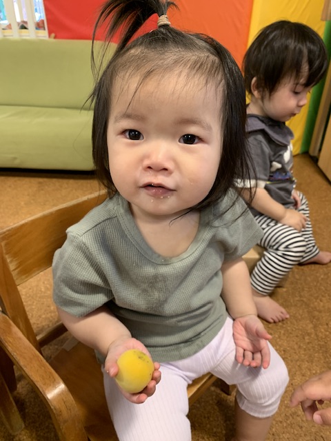 さくらんぼ組に届いたたくさんの梅。子どもたちに1つずつ渡すと、手でつついたり握ったりしながら感触を確かめていました。中には梅のいい香りを確かめようと、梅を鼻に近づけ嗅いでいる子もいました。
