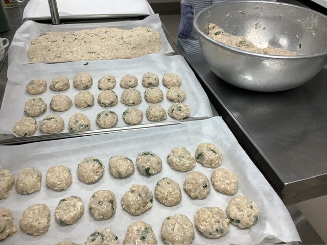 えのきを細かく切って塩をまぶし、余分な水分を出したところに、鶏ミンチ、千切りにした紫蘇をよく混ぜ合わせ、つくね型に成形します。