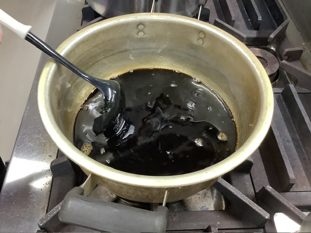 甘辛いタレは、みりん、濃口、きび糖に片栗粉で少しトロミをつけます。イメージは、みたらし団子のようなタレです。