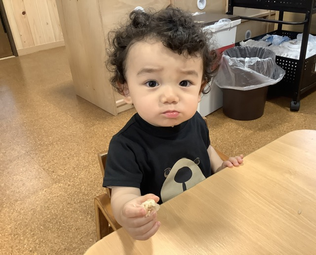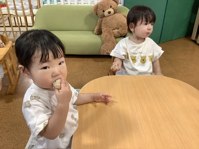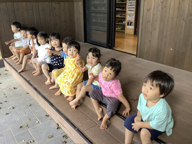 ゆり組さんは、テラスで並んで食べていましたよ〜!