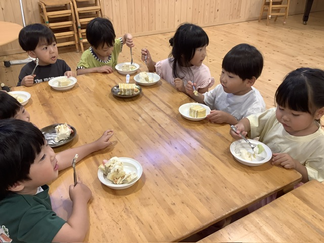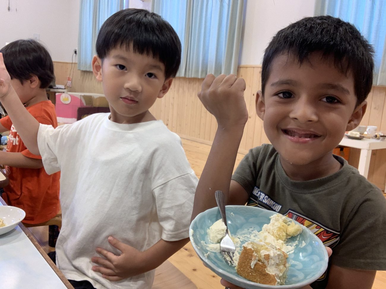 嬉しそうにケーキを頬張るこども達♡おかわりの行列もできました♪