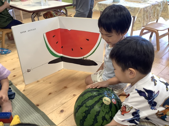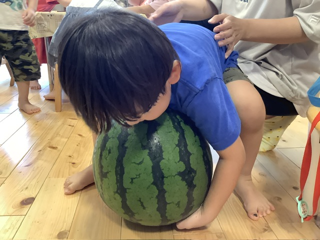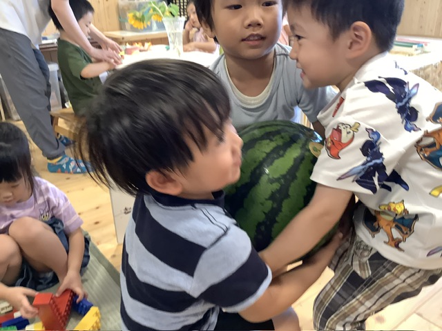 こども達に見せると、スイカの大きさにびっくり!一生懸命持ち上げようとする姿が可愛かったです♡