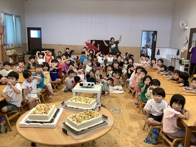 運動会を頑張ったこども達に、今日のおやつはなんと、、、大きな大きなひまわりさんのケーキが届きました。フルーツたっぷりの大きなケーキに大人もこどもも大興奮!