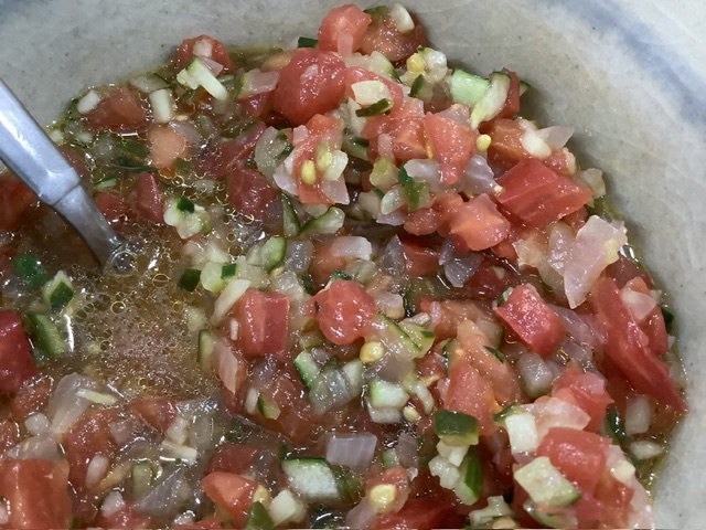 今回は、細かくみじん切りにした玉ねぎ・トマト・きゅうりを混ぜた夏野菜のソースを上からかけています。オリーブオイルと爽やかな甘酸っぱさのりんご酢で味を調えています。