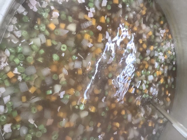 大豆を煮た煮汁もスープにいれますよ。南州農場のハムが入ることで旨味もアップして、ほっこり優しいスープが出来上がりました♪