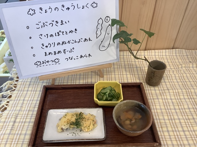 大豆を柔らかく煮たもの、インゲン、グリーンピースが入っていましたよ。子ども達は、お豆がどれか分かったかなー?