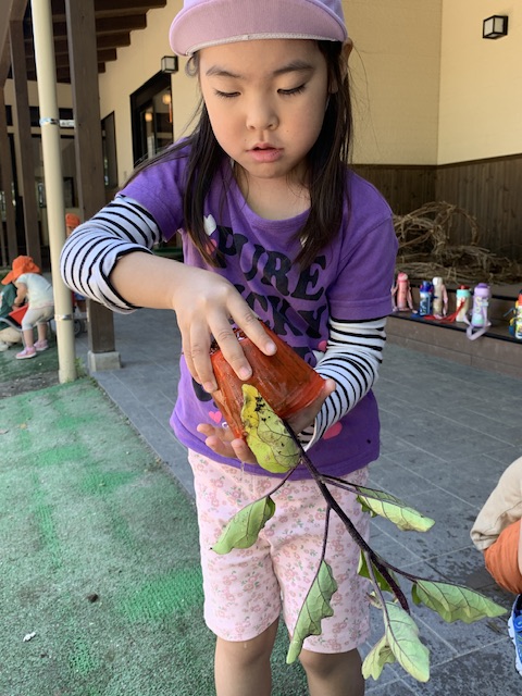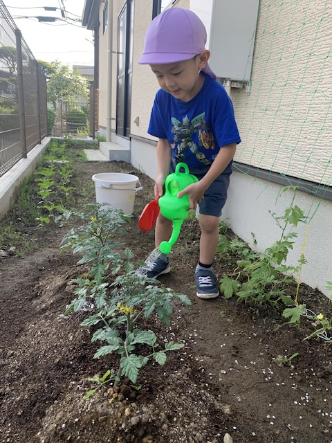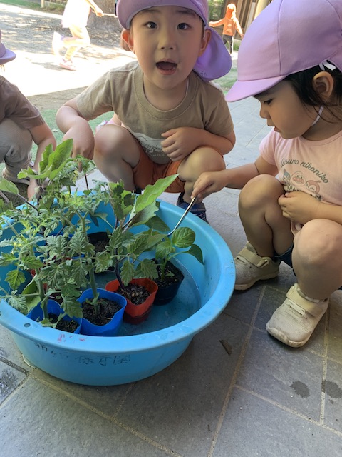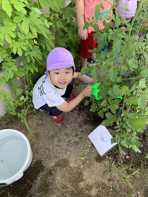 私たち人間は水がないと生きていけないように、子ども達が苗も同じようにそうなのだと考え、「水をあげなくてはならない」という結論にたどり着いてくれたことだけでも畑作りのねらいの一部が達成されたように思います。「水が大切なもの」であることは頭ではわかっているものの、手洗いの時に出しっぱなしにして遊んだり、トイレの水を何度も流したりしてしまうのはもう、ご愛敬です。今回のような畑作り(野菜や生き物の世話をする)の体験を何度も何度も繰り返すうちに、いつのまにか自分たちで「もったいないな」と気付けるようになってくれることを期待します。