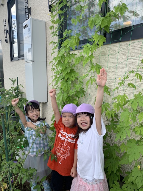 猛暑の中、子ども達の水やりのおかげですくすく育っているもも組の畑の野菜たち。ゴーヤのグリーンカーテンも保育室の窓から見えるようになり、子ども達の身長もとうに超えました。