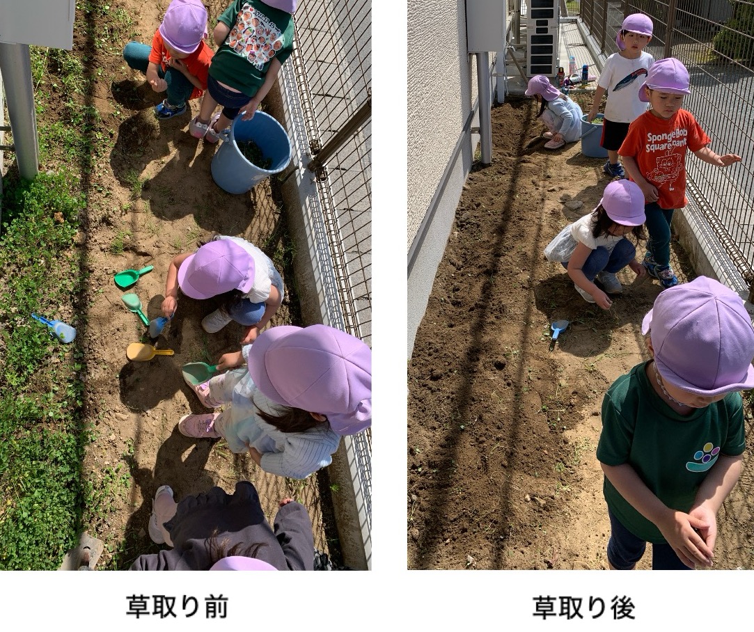 毎日暑い日が続いていますね。雨だったり暑さ指数が高かったりで、なかなか外で思いっきり遊ぶことができないもも組の子ども達。そんな子ども達が順番に楽しみにしていることがあります。それは、もも組保育室の建物裏のスペースに作った「畑」に行くことです!畑と呼んではいるものの、小さなスペースですので、一緒に行ける人数に限りがあります。4~5人ずつ交代で大人と一緒に行くことに、子ども達はそれぞれ特別感を抱いてくれているようです。今回は、畑に夏野菜を植えるまでの様子をお伝えしたいと思います。
