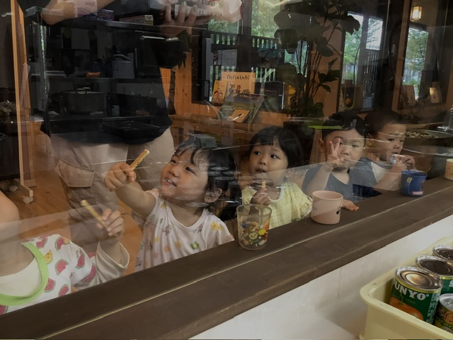 給食を作っていると、朝のおやつ中のゆり組のこども達が給食室に見に来てくれました!