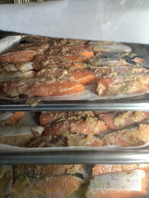 山口水産から届いた鮭に、梅干し、白味噌、きび糖、味の母、すりごまを混ぜて作った梅味噌を塗り、スチコンで焼き上げました。
