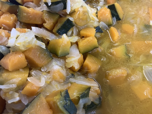 かぼちゃと玉ねぎは、食べやすい大きさに切り、スチコンで蒸したら、オリーブオイルなどで手作りしたマリネ液に漬け込みます🎃