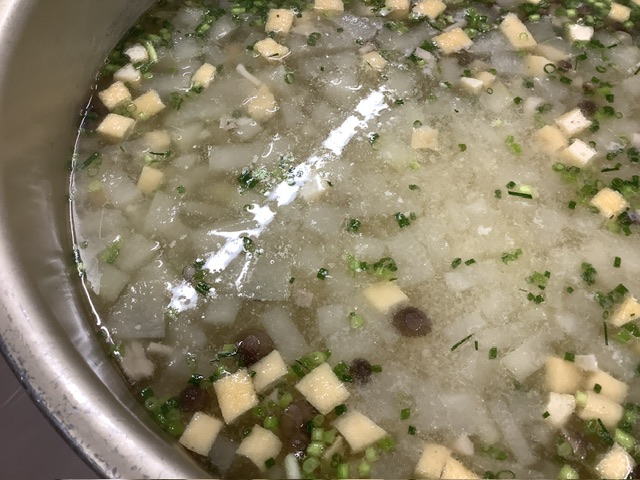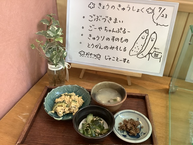 今日の献立には、主菜にゴーヤチャンプルー、みそ汁にとうがんをいれました。