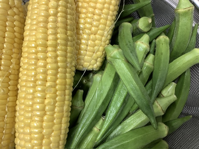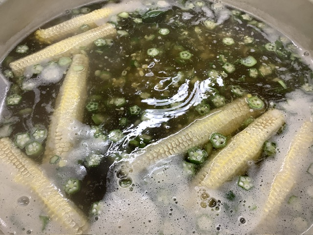 いりこと鰹節から出汁を取り、具材にはとうもろこしとおくらが入っています。