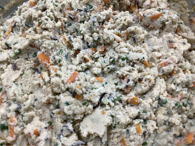 昆布とかつお節で出汁をとり、おから、にんじん、きくらげ、薄揚げを調味料と一緒に煮詰めたら、仕上げに小ネギを散らしました。