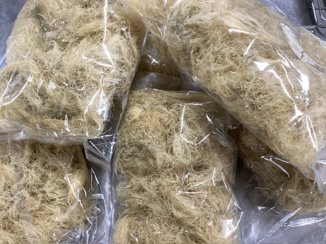 煮出した液を、バットに広げて冷やし固めて、ところてん突きで突いていきました。