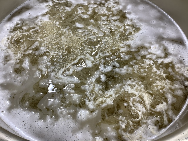 乾燥した状態の天草を、たっぷりのお湯と酢でぐらぐらと茹でて寒天液を煮出します。