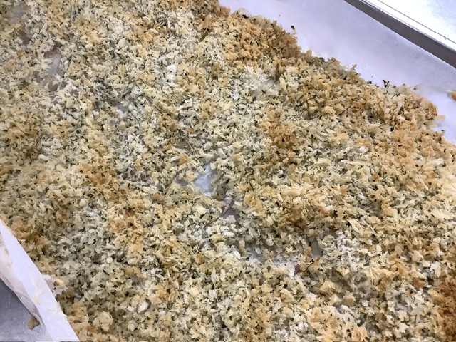 パン粉には全体にオリーブオイルと米油を混ぜ込んでからお肉にまぶしているので、揚げ焼きのようになり、サクサク食感に仕上がりました。