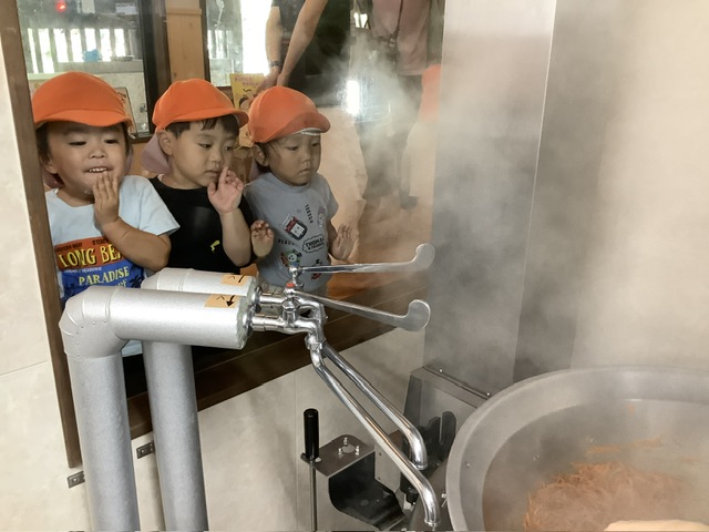 回転釜で沢山のにんじんを炒めている姿に、興味深々!