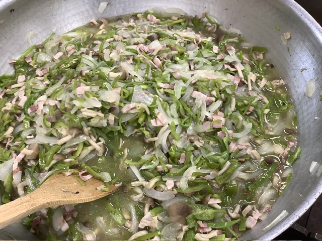 南州農場のベーコン、35ファームのピーマン、しめじを塩胡椒で味付けしたシンプルなソテー。